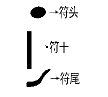 通常来说,音符由符头、符干、符尾三部分组成;符头可以是空心的,也可以是实心的(详见下图),两者拍数相差一半;除了全音符之外,其它的音符都有符干,增加符干原来时值也减一半。