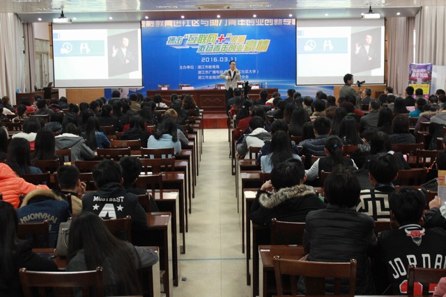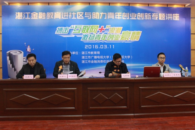 3月11日下午,湛江市广播电视大学在主校区礼堂隆重举行广东金融教育进社区与助力青年创业创新项目(湛江)专题讲座。本次讲座由湛江市教育局、湛江市广播电视大学(湛江社区大学)和湛江市金融消费权益?;ち匣峁餐靼欤匮?0后互联网(电商)创业者,湛江电子商务商会副会长,前行者电商学院院长,晶典电商生态链创始人朱丰茂主讲,主题为"搏击'互联网+'浪潮,激扬青年创业豪情"。