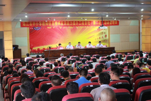 5月5日至5月8日和5月10日至5月13日,湛江市中小学教师信息技术应用能力提升工程首批校(园)长、区域及学校管理者、骨干教师集中培训工作,分两期在我校校本部隆重举行。湛江市教育局袁新中副局长、湛江市教师继续教育指导中心段亚东主任和全国慧副主任、湛江市教师进修学校主持全面工作的林飞副校长和来自赤坎区、霞山区、坡头区、麻章区、吴川市、湛江经济技术开发区、南三岛滨海旅游示范区、廉江市、遂溪县等地教育行政部门负责人、中小学校长、幼儿园园长、区域培训管理员及市直属中小学分管校长、培训管理员共800余人参加了开班仪和培训。开班仪式由湛江市教师继续教育指导中心段亚东主任主持。