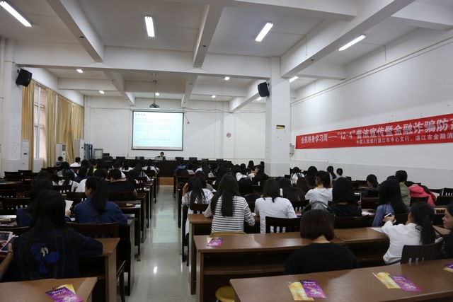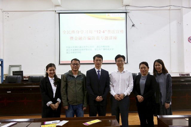 12月13日,为广泛宣传全民学习、终身学习理念,湛江市广播电视大学(湛江社区大学)联合中国人民银行湛江中心支行、湛江金融消费权益?;ち匣嵩谡拷胁泼逞>侔烊裰丈硌爸?"12.4"普法宣传暨金融诈骗防范专题讲座。