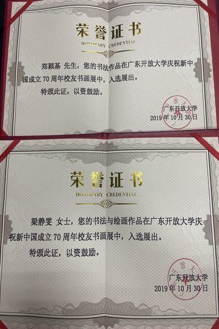近日,我校梁静雯老师和17秋行政管理本科班郑颖基同学收到广东开放大学颁发的荣誉证书。 梁静雯的书法作品《砥砺奋进七十载,筑梦前行启新篇》与绘画作品《绿水青山》和郑颖基的书法作品《唐诗两首》,均入选广东开放大学"庆祝建国70周年校友书画展"。