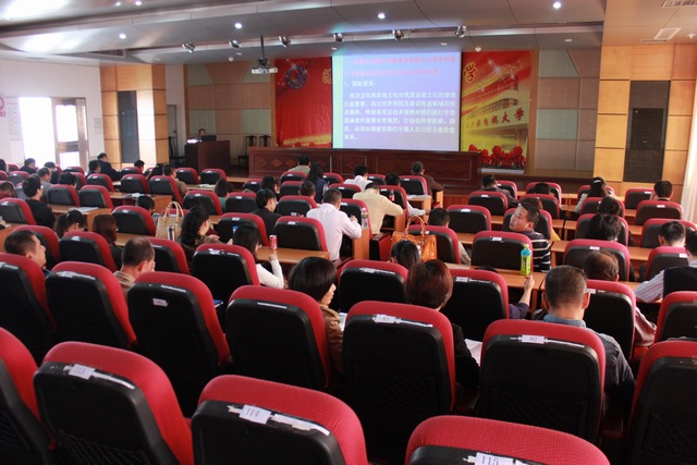 根据我校全年政治理论学习计划安排,12月10日,学校在11楼召开专题学习会,校领导班子及全体教职工参加了学习。学校副校长尤祖国同志作了题为"加强社会主义核心价值体系建设,积极培育和践行社会主义核心价值观"的专题报告,他对社会主义核心价值体系、价值观的基本内容和如何践行社会主义核心价值体系、价值观进行了阐述,提高了教职工的思想认识。