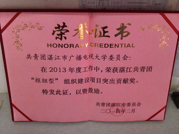 共青团湛江市十二届十次全委(扩大)会传来喜讯,湛江市广播电视大学团委荣获"湛江市2013年度"枢纽型"组织建设项目突出贡献奖"。