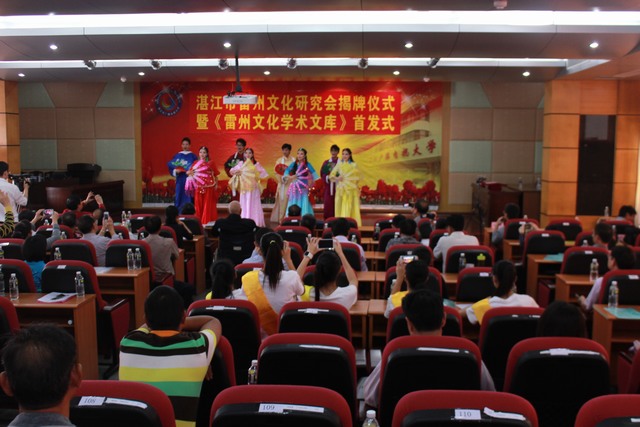 活动由我校党委书记、校长、湛江市雷州文化研究会副会长李连红主持,市社会科学界联合会主席余伟民和原市委组织部副部长、雷州文化研究会常务副会长、法人代表陈华江分别在会上致辞。会议增选了部分学会领导成员,现场还展示了岭南雷阳书院院长陈乔森120多年前画作,岭南师范学院音乐学院的师生们在会上演唱了《雷州姑娘歌》。