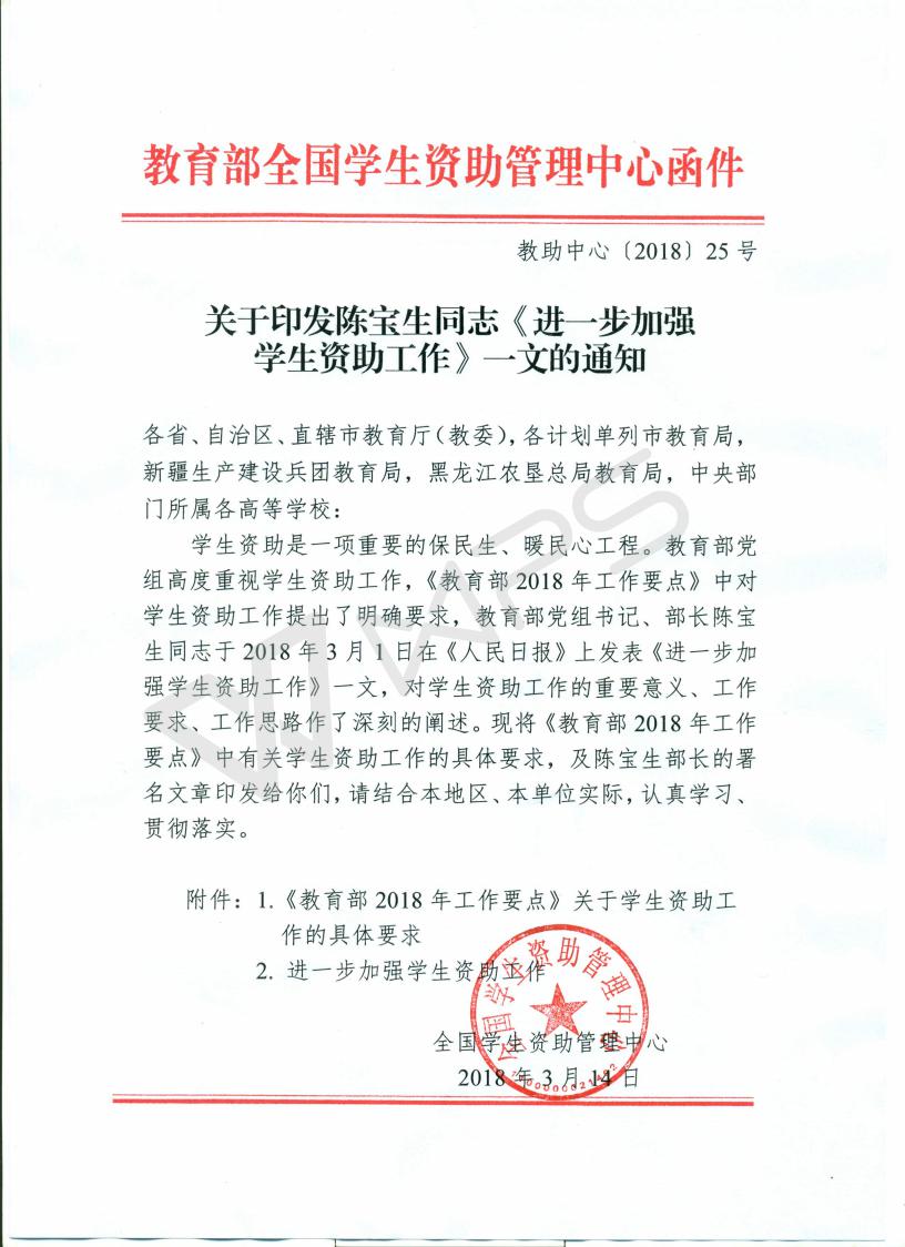 - (教助中心[2018]25号)关于印发陈宝生同志《进一步加强学生资助工作》一文的通知