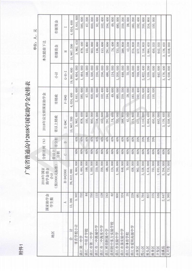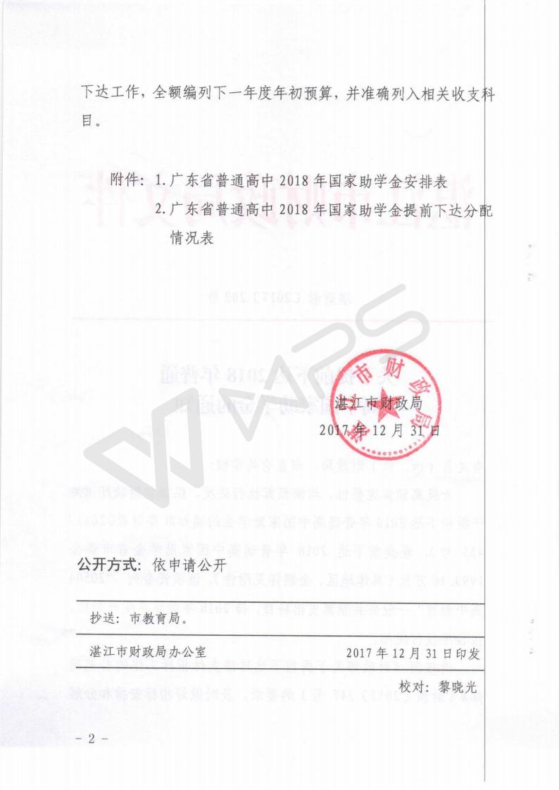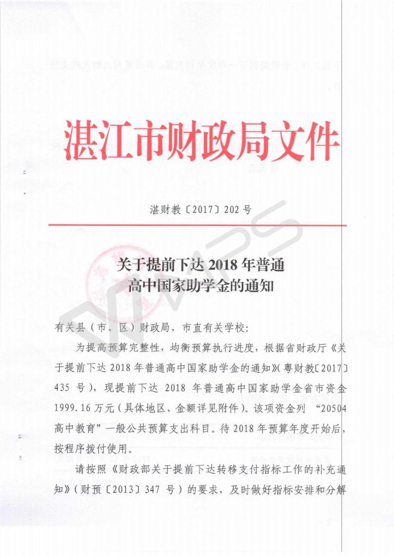 湛财教【2017】202号 关于提前下达2018年普通高中国家助学金的通知