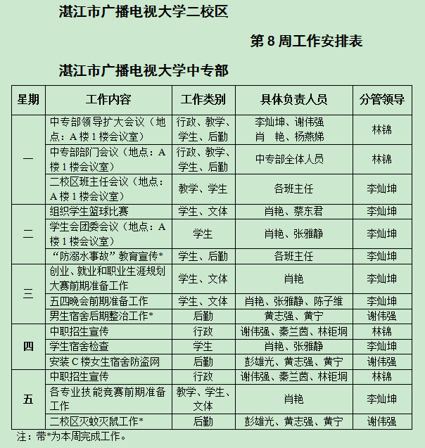 主校区和中专部第8周工作安排