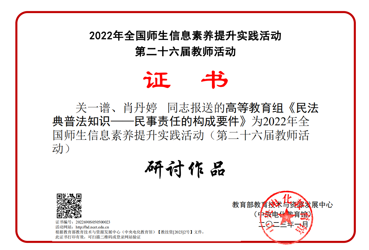 在 2022 年全国师生信息素养提升实践活动(第二十六届教师活动)中,由我校普法团队成员关一谱报送的高等教育组作品《民法典普法知识 —— 民事责任的构成要件》,被评定为研讨作品,这一成果充分彰显出团队强劲的业务能力。