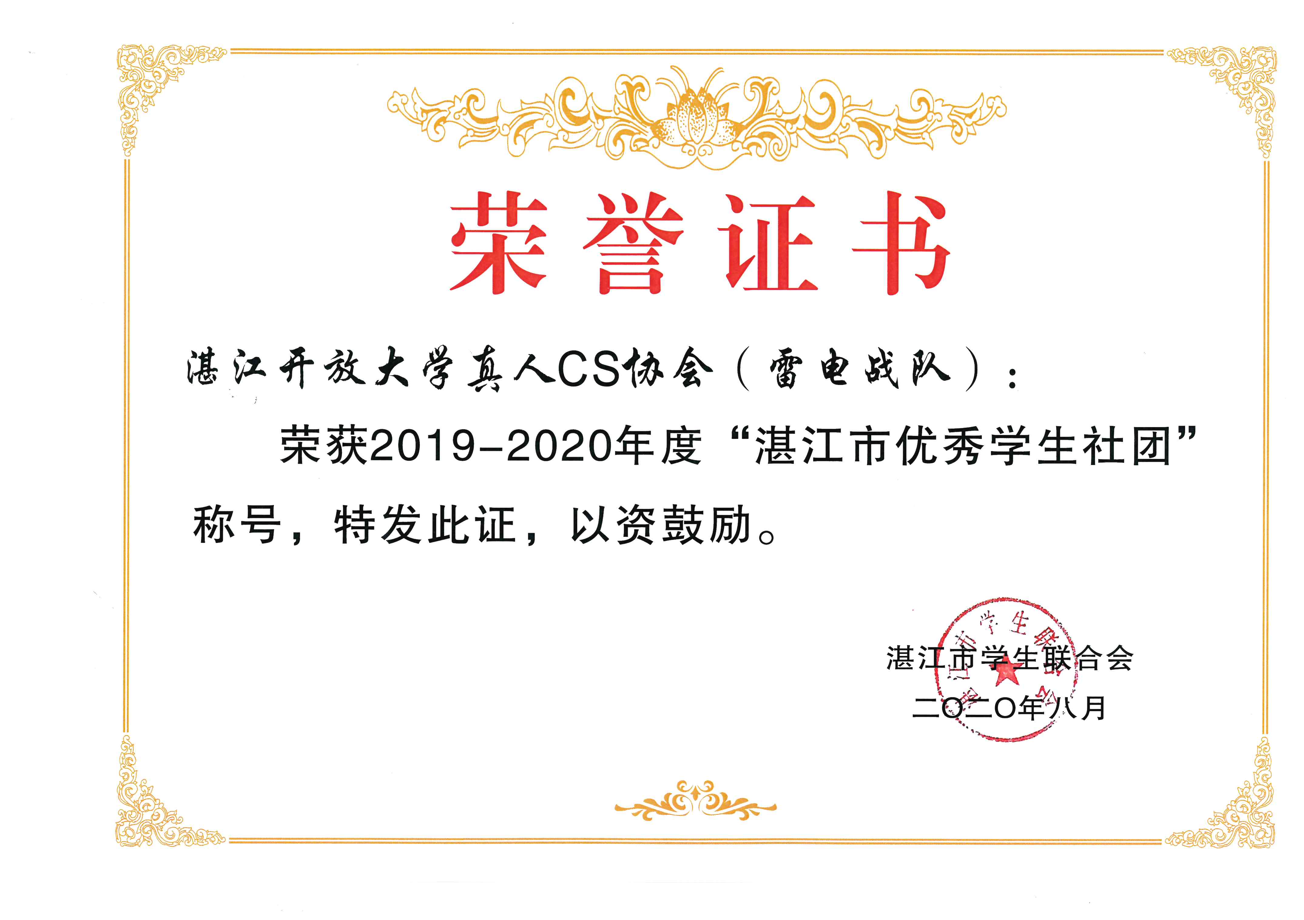 3.湛江开放大学真人CS协会(雷电战队)荣获2019-2020年度“湛江市优秀学生社团”称号;