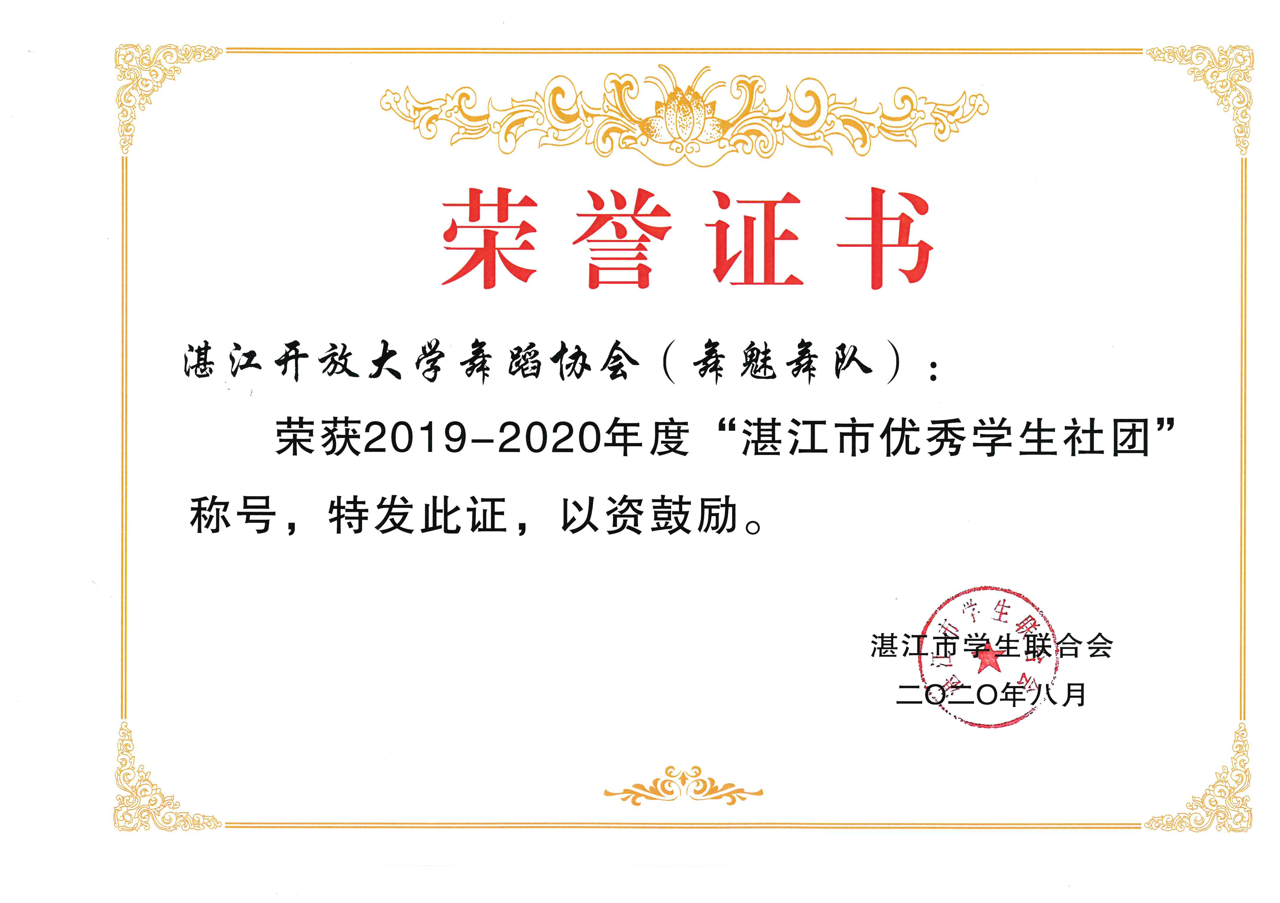 2.湛江开放大学舞蹈协会(舞魅舞队)荣获2019-2020年度“湛江市优秀学生社团”称号;