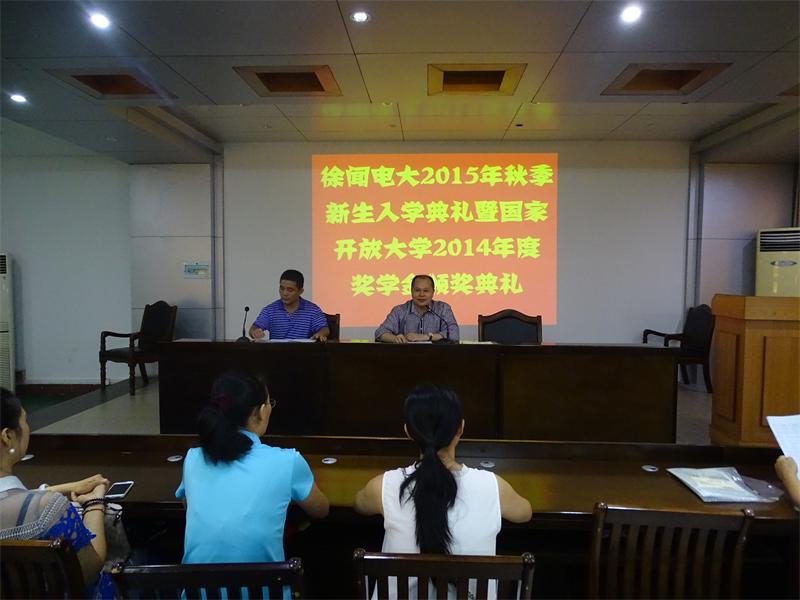 [徐闻电大黄海波李春霞报道]朗朗金秋,丹桂飘香。29日上午9点,徐闻电大2015年秋季开学典礼暨优秀毕业生奖学金表彰大会在学校一楼西多媒体教室顺利召开。学校副校长苏岩、相关部门负责人出席了典礼大会。2015年秋季新生代表、2014年度优秀毕业生及奖学金学生代表参加了开学典礼。大会由教务处主任韦华纪主持。