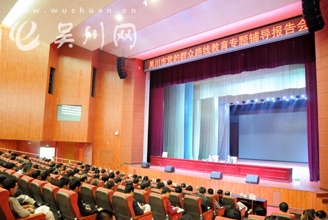 [吴川电大 陈耀报道]根据吴川市党的群众路线教育实践活动安排,为进一步帮助全市领导干部深刻领会群众路线的基本内涵,提高领导干部思想政治素质和理论水平,在工作中更好地践行群众路线,推动工作落实,3月25日上午,吴川电大邀请省委党校副校长马星光教授前来作辅导报告。吴川市委书记曹兴主持并作讲话,四套班子领导,各镇(街)班子成员及副科级以上干部,市直(驻吴)副局以上单位班子成员及副科级以上干部,市实践办及督导组全体同志聆听了报告。