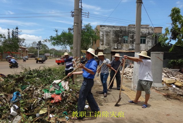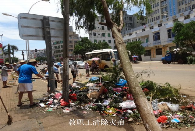 天灾无情人有情!在常务副校长潘建义同志的带领下,徐闻电大人迅速投入救灾复产行动中。20日上午潘校长一行3人赶赴锦和镇参加救灾复产现场会议?;岷?,学校迅速成立"救灾复产工作领导小组",制定方案,落实人员,积极配合县委、县政府的救灾复产工作。21日上午潘校长和杨腾副校长再次带队8人奔赴挂点的锦和镇东山、胜利两个村委会调研摸底灾情。经了解,东山村委会受损房屋210间,严重80户农作物受损2000亩,其中700亩香蕉全部绝产。胜利村委会受损房屋320间,严重60户,10多间茅草屋全部倒塌600亩香蕉绝产投资4万农村文化场所铁棚被风吹走。摸清情况后,潘校长决定从学校有限的资金中,各帮扶两个村委会5000元救灾复产启动资金,并准备救灾生活用品分发到困难群众和五?;е?,最后详细和村委会班子成员谋划复产工作安排。为确保救灾复产顺利进行,学校还抽调专门人员和挂点村委会联系,展开救灾复产的具体工作。匆匆忙忙从困难群众家中回来,潘校长马不停蹄又组织学校所有教职工到街上开展灾后卫生清理整治,与群众一起共同消除灾痕、消除垃圾,用实际行动维护市容市貌的整洁。清扫工作持续10多小时,直到晚上8点多才完毕,共计清扫多达15车的垃圾。尽管大家累得不成样,但看到路面貌焕然一新,疲劳又消失得无影无踪了