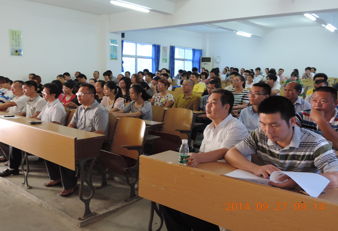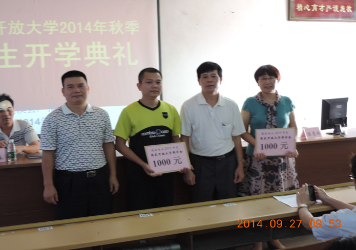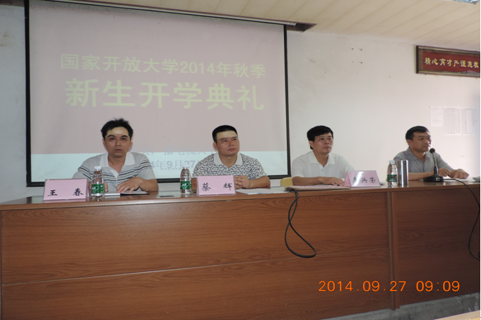 [遂溪电大陈 峭报道]9月27日上午九时,遂溪电大901电教室座无虚席,184名国开新生参加了2014年秋季简短而隆重的开学典礼。大会由陈恩林副校长主持,李兴荣校长及其他班子成员一同出席典礼?;嵘?,李兴荣校长作了热情洋溢的讲话。他首先代表学校向新学员表示热烈欢迎和衷心祝贺,接着向新学员介绍了国家开放大学(电大)的历史沿革以及学校的基本情况,最后对新学员的学习、工作和生活提出几点殷切期望。据统计,本校今季共招生184人,其中本科40人,专科144人,含"一村一大"五期班31人。会上,还对2013年度获得国开大学奖学金的学员进行颁奖?;岷?,教务处和科任教师给新生进行了国开学习和考试等入学指南教育。