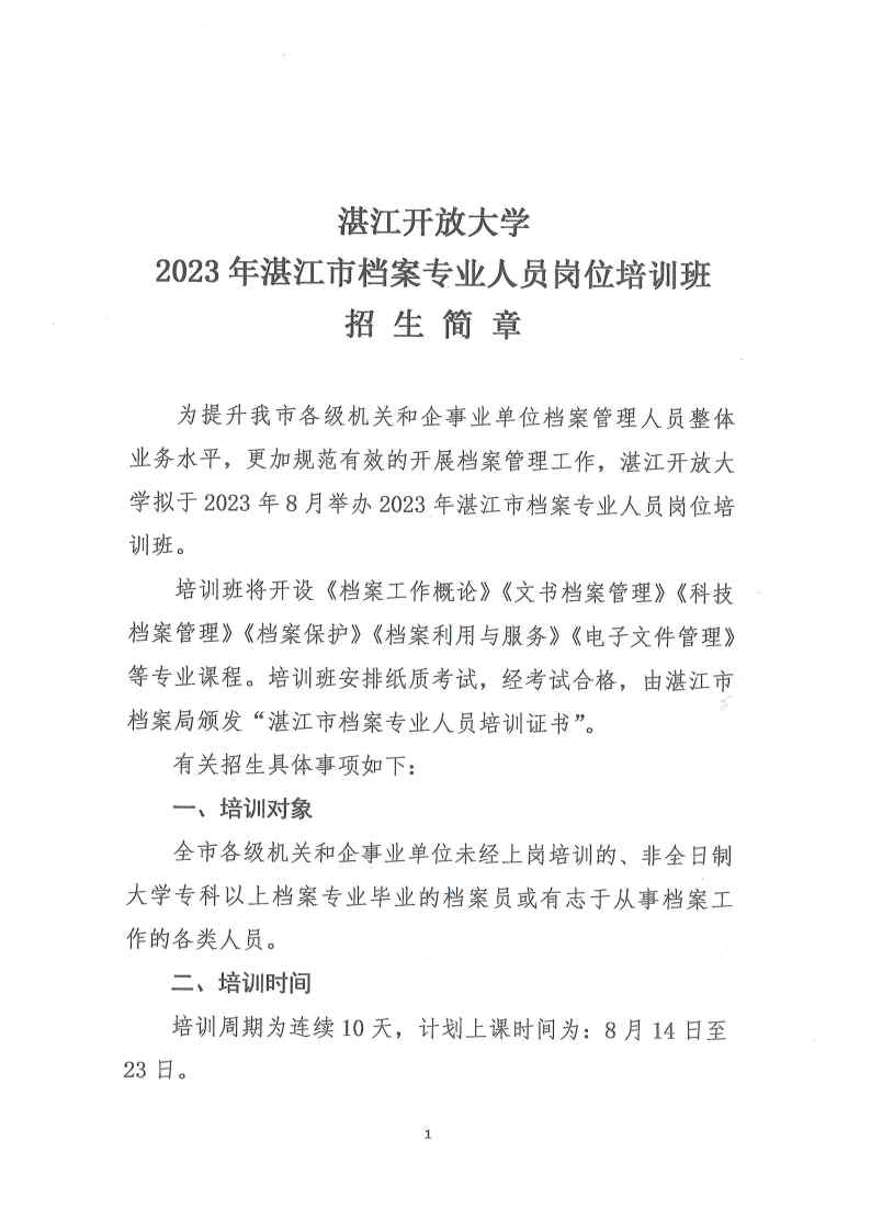 湛江开放大学2023年湛江市档案专业人员岗位培训班招生简章