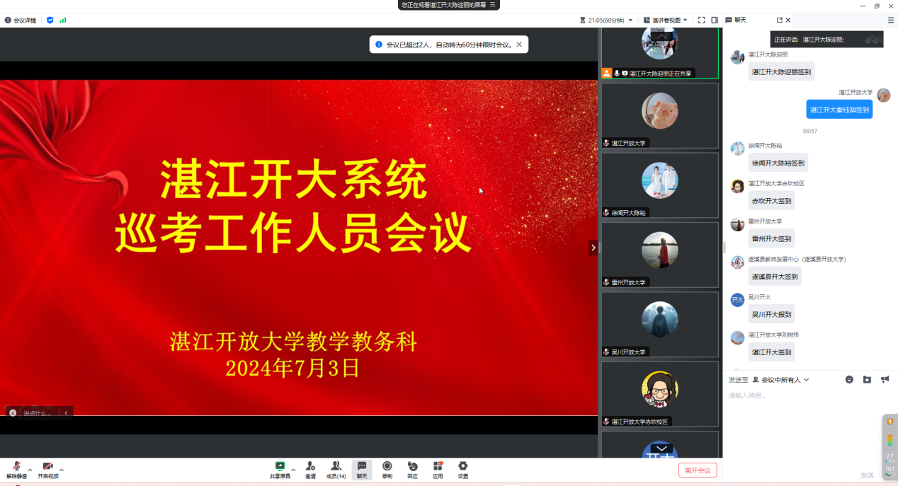 7月3日上午,我校通过腾讯会议召开2024春期末考试湛江开放大学系统巡考工作人员线上会议。来自湛江开放大学系统各考点的考务工作负责人、巡考工作人员参加了会议?;嵋橛烧拷糯笱Ы萄Ы涛窨瞥掠鲋鞒?。