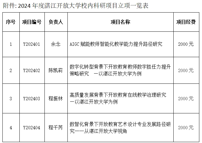 经学校学术委员会审核评定、学校研究决定,批准以下湛江开放大学校内科研项目立项。(具体名单详见附件,并对每个立项项目给予经费资助。)