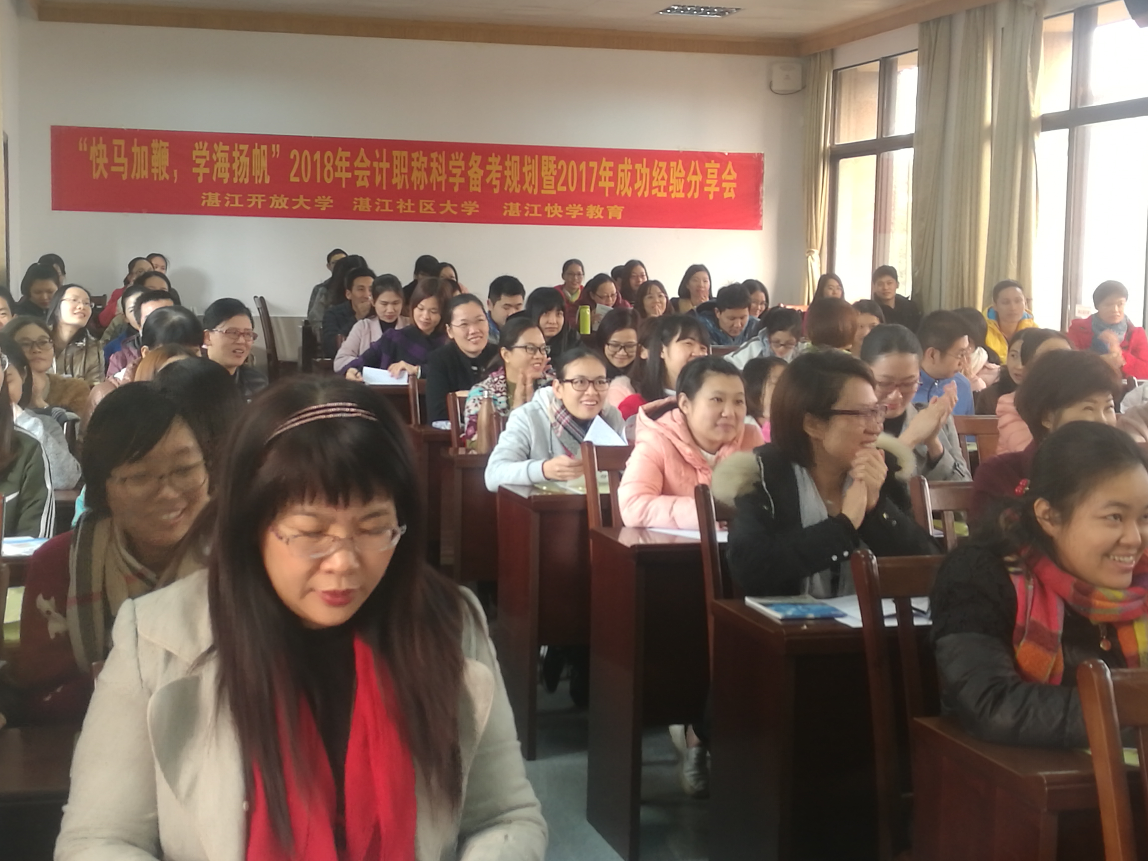 12月17日上午,湛江开放大学在校本部B501室举办"快马加鞭,学海扬帆"2018年会计职称科学备考规划暨2017年成功经验分享会。100余人参加听课,现场座无虚席,学生反应热烈。