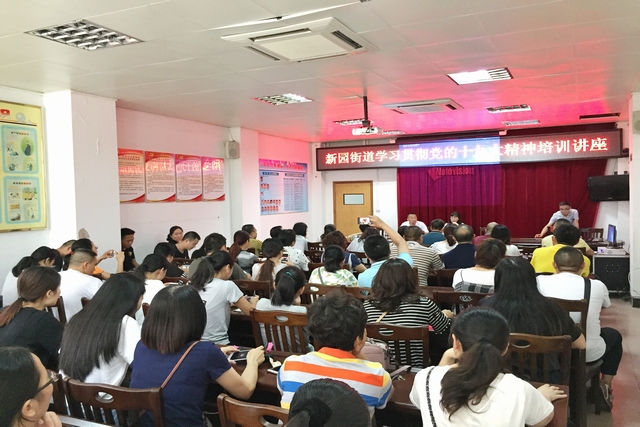 本次讲座在湛江市霞山区新园街道办举行,由湛江开放大学李静老师主讲,主要学习党的十九大报告精要,探讨党的十九大报告中关于社区党建工作的意见及其现实指导意义和党的十九大报告中关于社区治理的意见及其现实指导意义。