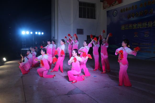 由湛江开放大学教工艺术团带来的乐队表演拉开了晚会的序幕,老师们的倾情演出赢得了观众热烈的掌声,体育场的氛围一下子被点燃,舞台下的观众纷纷用手机亮灯跟随歌声的节奏摇摆,现场成了一片欢乐的海洋随后的快板表演《弟子规》、专业展示《开大学子展风采》以节目的形式把学校的办学特点和重点专业形象地向市民朋友们展现,赢得了阵阵喝彩,舞蹈《雨打芭蕉》、《中国民族风》、《出发》、《四海一家》充满着青春活力和激情,舞蹈《Jamyo Gentleman》、《你好,时光》动作优美,引人入胜,女生独唱《草原的月亮》把晚会带向了高潮,湛江社区大学老年学习班学员带来的舞蹈《好日子》、旗袍表演《徽州美》体现了终身学习、全民学习的魅力。
