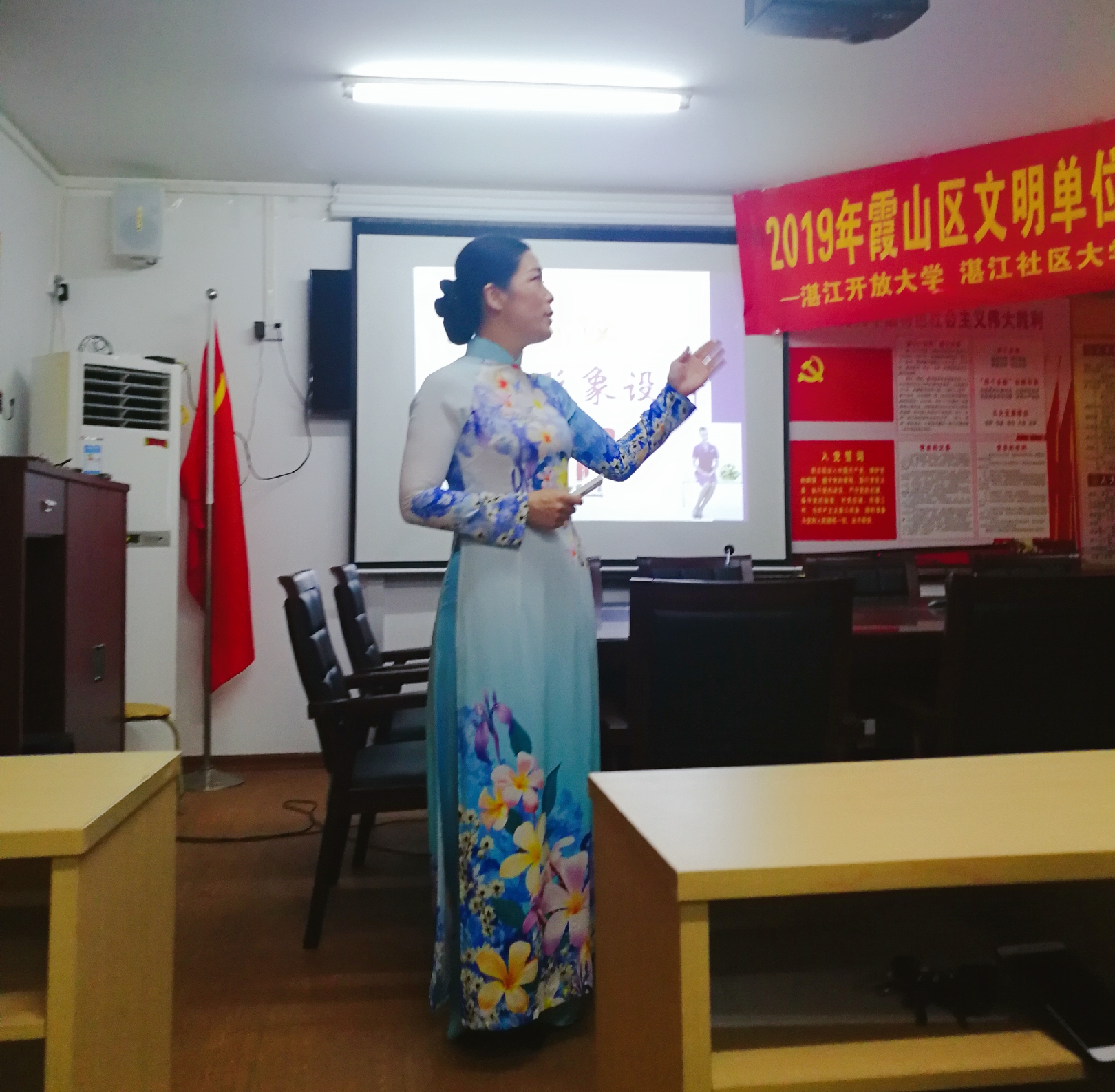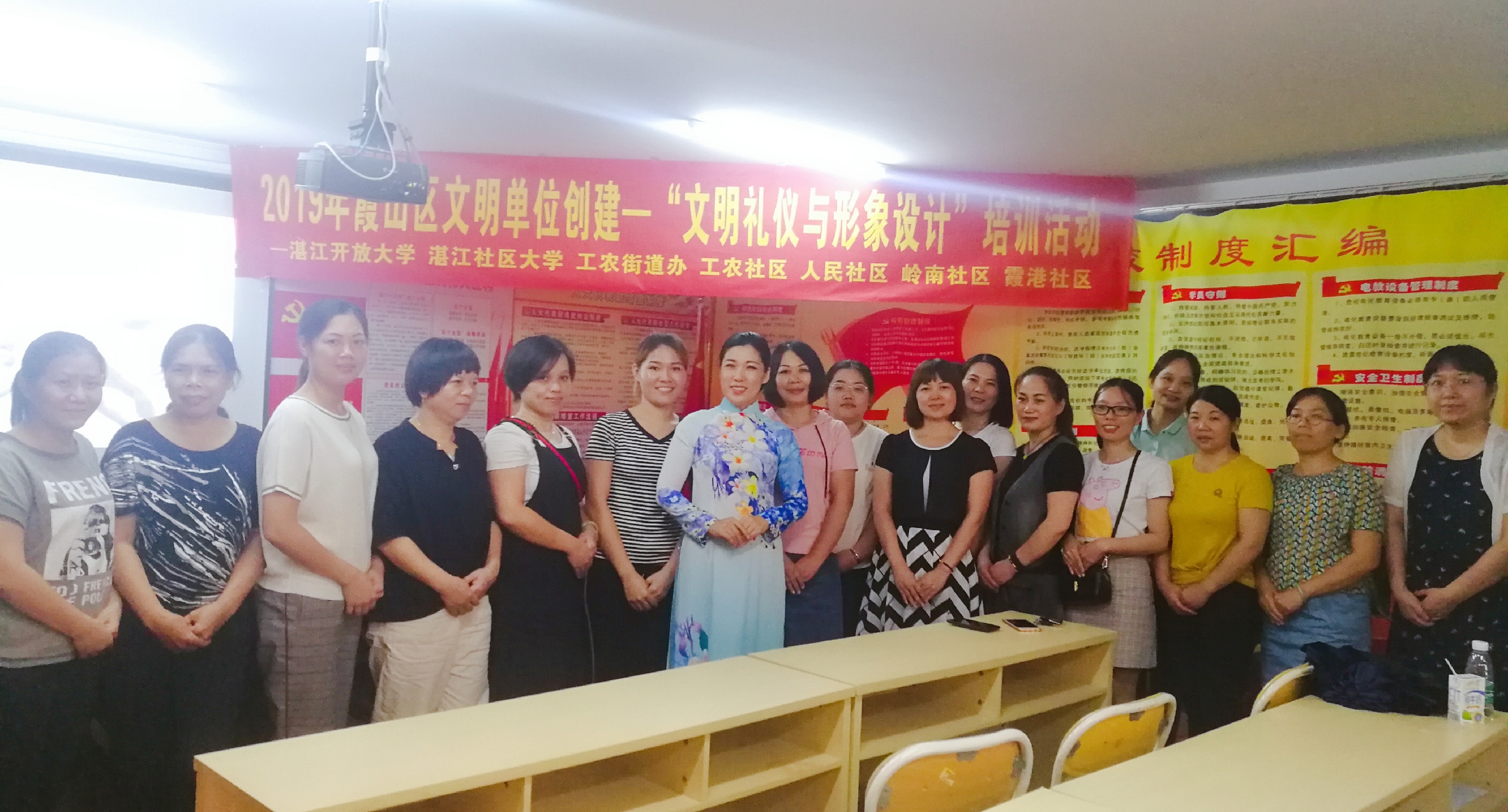 为加强文明礼仪知识学习,提高街道工作人员的整体素质,5月31日上午午,我校联合湛江春晓形象礼仪培训机构、工农街道办,在工农街道办四楼会议室开展"文明礼仪与形象设计"培训活动?;疃胄蜗笮翁甯呒督彩斡敝鹘?,近50余名街道和社区的工作人员参加了此次活动。