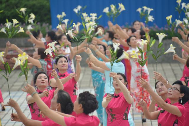 当天160多名参与者手持百合花,通过身穿形体服、旗袍等多彩的服饰,在《若水杭州》、《旗香·醉荷》的音乐背景下,组成方阵或圆形的各种队列,轻盈舞步,欢歌笑语,那有说不出的妩媚,道不尽的优雅,如同多彩的画卷,充满典雅的气息?;疃浞终瓜终拷越】滴拿鞯木穹缑玻惴⒘苏拷率贝远陨畹脑廾?。这场精美绝伦的展示在现场观众阵阵掌声和喝彩声中成功的落下了帷幕!