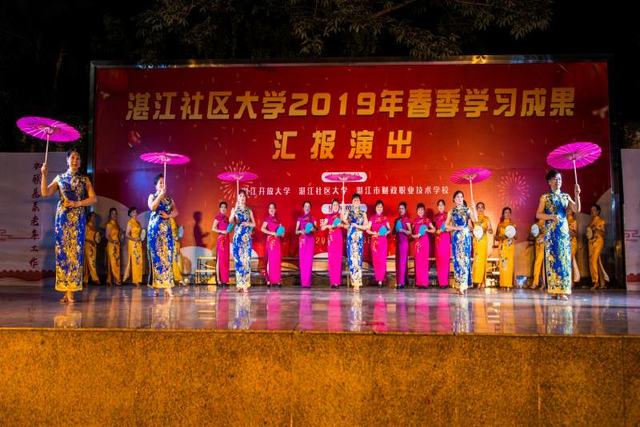 接下来进行学员学习成果展演,参与展演的有旗袍班、时装模特班、太极拳班、合唱班等十余个班别。湛江社区大学的学员们热情洋溢、以饱满的激情向大家展现了精彩纷呈的表演。其中,《再唱山歌给党听》、《我和我的祖国》、《海滨情》是社区大学学员为庆祝中国共产党成立98周年和中华人民共和国成立70周年进行精心准备的节目,美妙的歌声摇曳在滨海城市湛江的上空,歌中的故事娓娓道来,音乐声中引起大家对家国的共鸣,引得台下连连赞叹?!斗商炖治琛?、《旗袍美人》、《陈式太极十八式》、《旗香.醉荷》等节目展现了社区大学兴趣班的无限魅力,赢得了阵阵掌声。