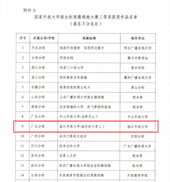 根据《关于开展国家开放大学招生创意微视频及工作案例征集评选活动的通知》(国开招[2019]1号),我校招生创意微视频《抽空把大学上了》在33个分部、2个专业学院和3个行业学院的105个微视频作品中脱颖而出,经过网上投票和专家组线上及会议评审,荣获国家开放大学招生创意视频大赛三等奖。