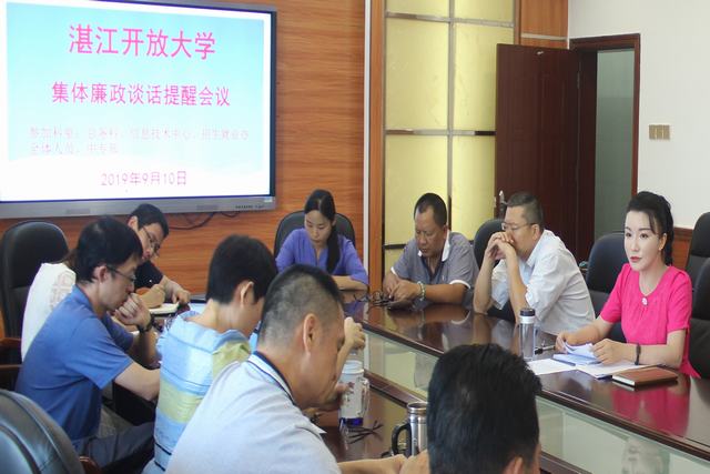 中秋、国庆节将至,为加强警示教育,营造风清气正的节日氛围,同时进一步加强学校党风廉政教育工作,9月10日,湛江开放大学召开2019年第三季度集体廉政谈话提醒会议,纪委书记江宇静主持会议,学校行政科、招生就业中心、信息技术中心科室全体人员及中专部等重要科室和关键岗位人员参加会议。