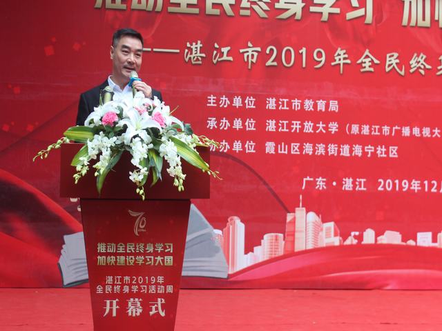 湛江市教育局副局长夏开晓在致辞中表示,湛江市高等继续教育事业蓬勃发展,全民终身学习氛围日益浓厚,学习型社会建设步伐加快,特别是依托湛江开放大学为主的社区教育成效显著。希望大家以全民终身学习活动周为契机,牢固树立"终身学习"理念,不断学习、不断充实自我,加快学习型社会的建设。