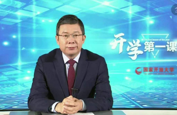开学典礼上首先播放了国家开放大学党委书记、校长荆德刚主讲的题为"爱国与成长"的 "开学第一课",开篇运用三个小故事,阐述了国开人的爱国情怀与责任担当,疫情面前,国开师生守望相助,众志成城。