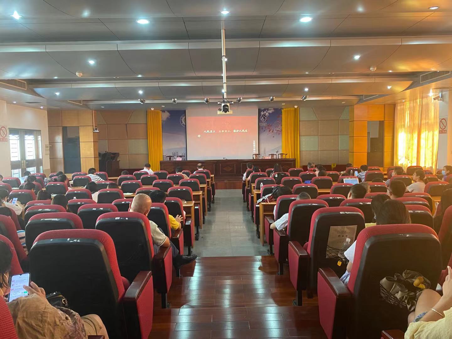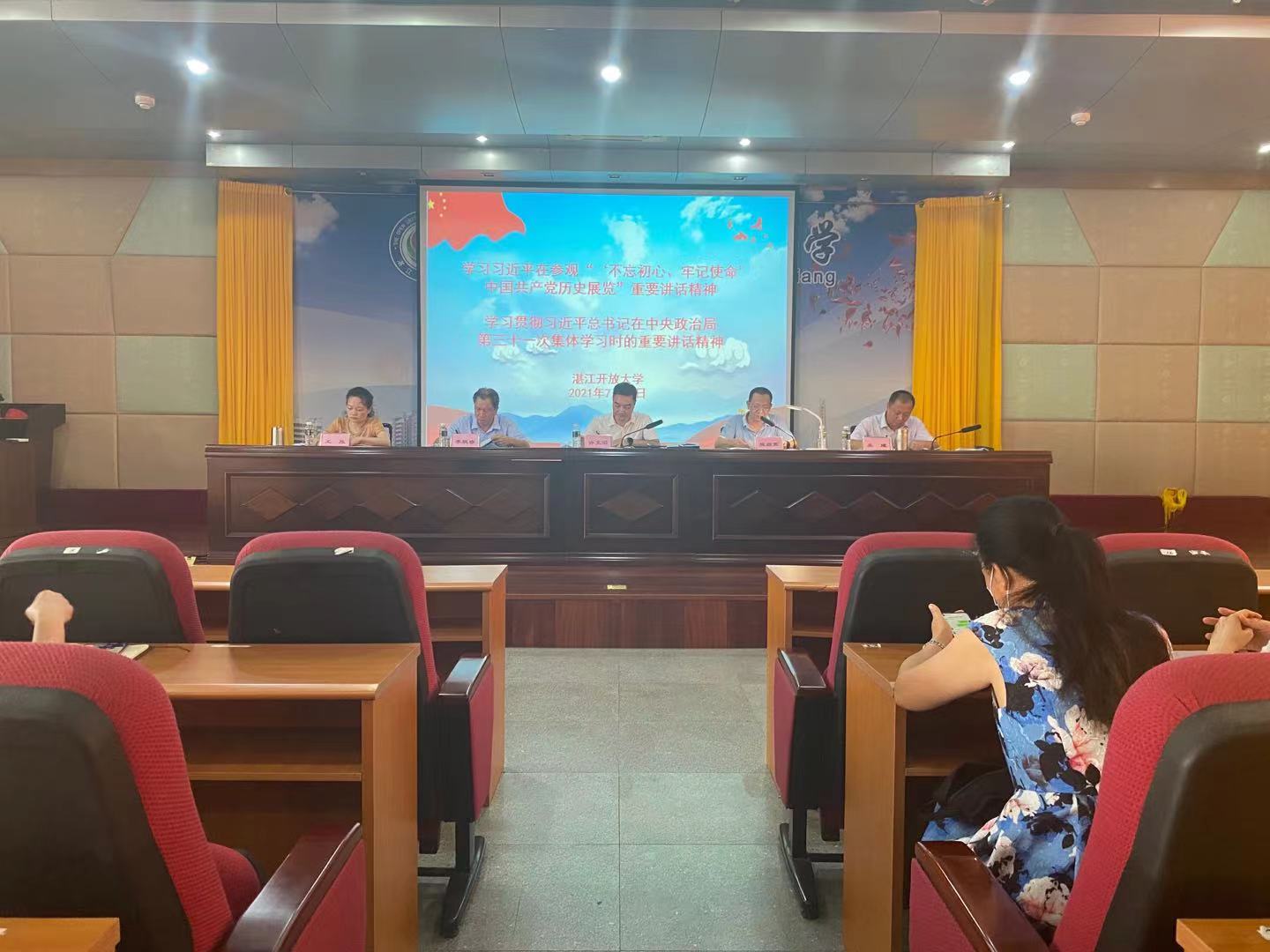 7月16日下午,湛江开放大学在校本部11楼学术报告厅召开全职工学习会议。内容分为五个部分:一是学习习近平在参观"'不忘初心、牢记使命'中国共产党历史展馆"重要讲话精神和习近平总书记在中央政治局第三十一次集体学习时的重要讲话精神;二是宣读我校7位同志的高聘通知并颁发聘书;三是校党委书记、校长许文滔同志向全体教职工作我校2021年上半年的工作报告;四是校党委副书记熊焱高同志对暑假工作的要求讲话;五是观看学习《生命重于泰山——学习习近平总书记关于安全生产重要论述》电视专题片。学校党委领导班子和全体教职工参加会议。