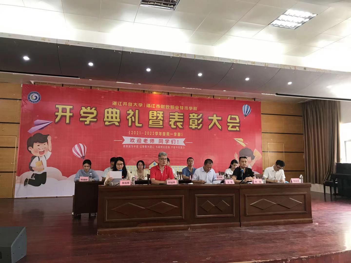 9月6日上午,湛江开放大学 湛江市财政职业技术学校在礼堂隆重举行了2021-2022学年开学典礼暨表彰大会。湛江市财政职业技术学校领导、各部门及教研室负责人,班主任及2021级新生,共计300余人到场参加开学典礼??У淅裼烧拷胁普耙导际跹3N窀毙3ち纸跬局鞒?。