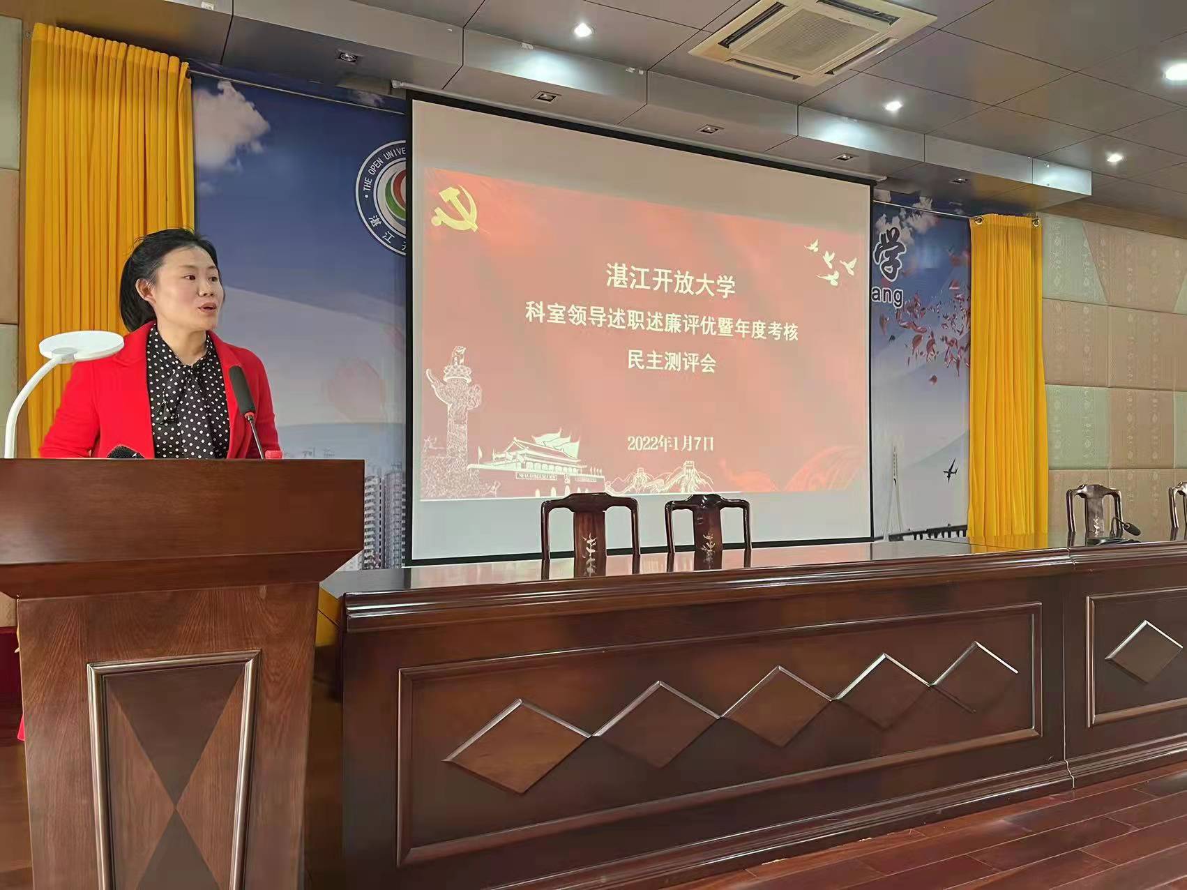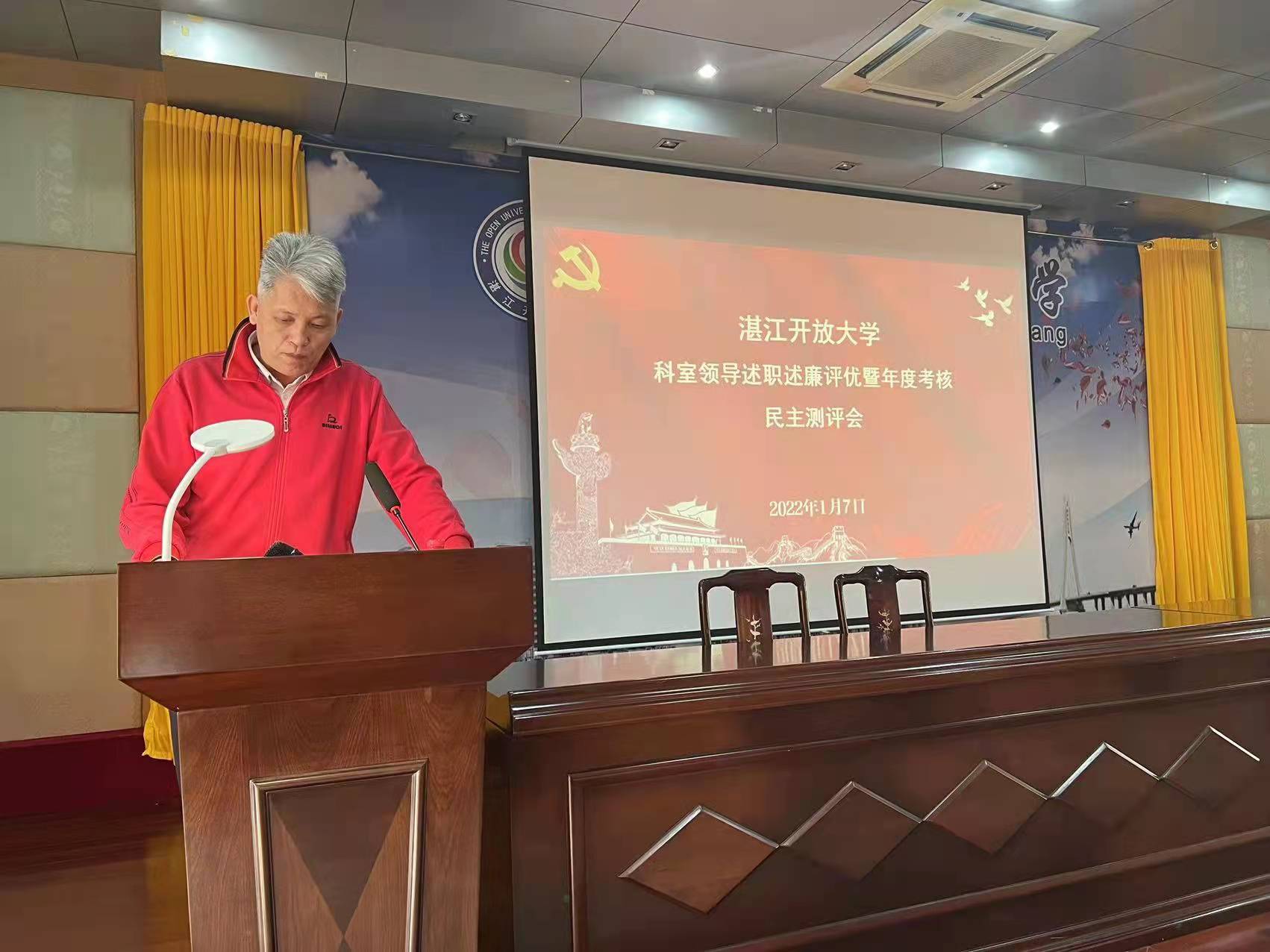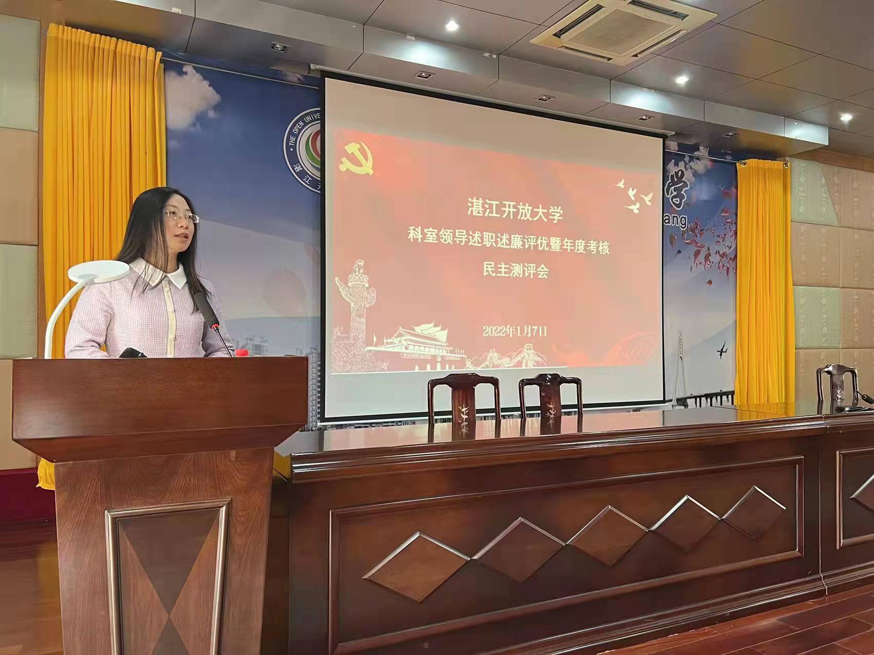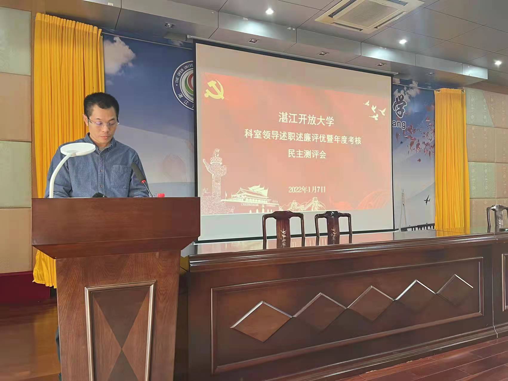 1月7日,湛江开放大学2021年度科室领导述职述廉评优暨年度考核民主测评会在校本部11楼多功能报告厅举行。湛江开放大学全体教职工参加会议。
