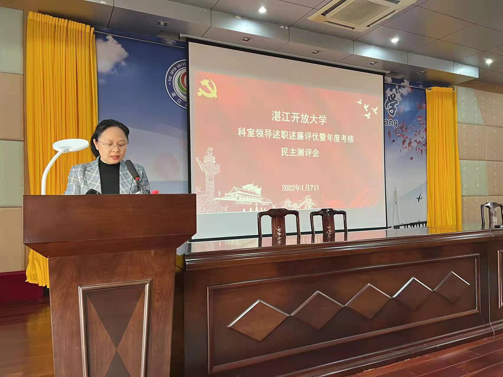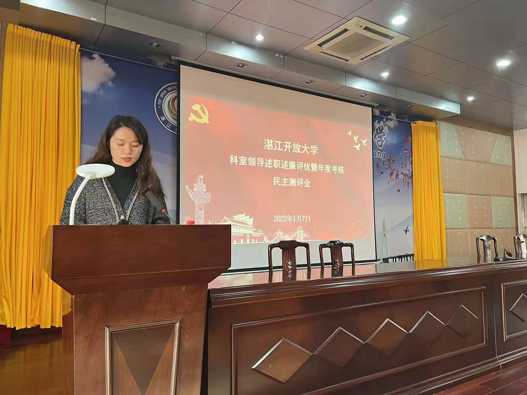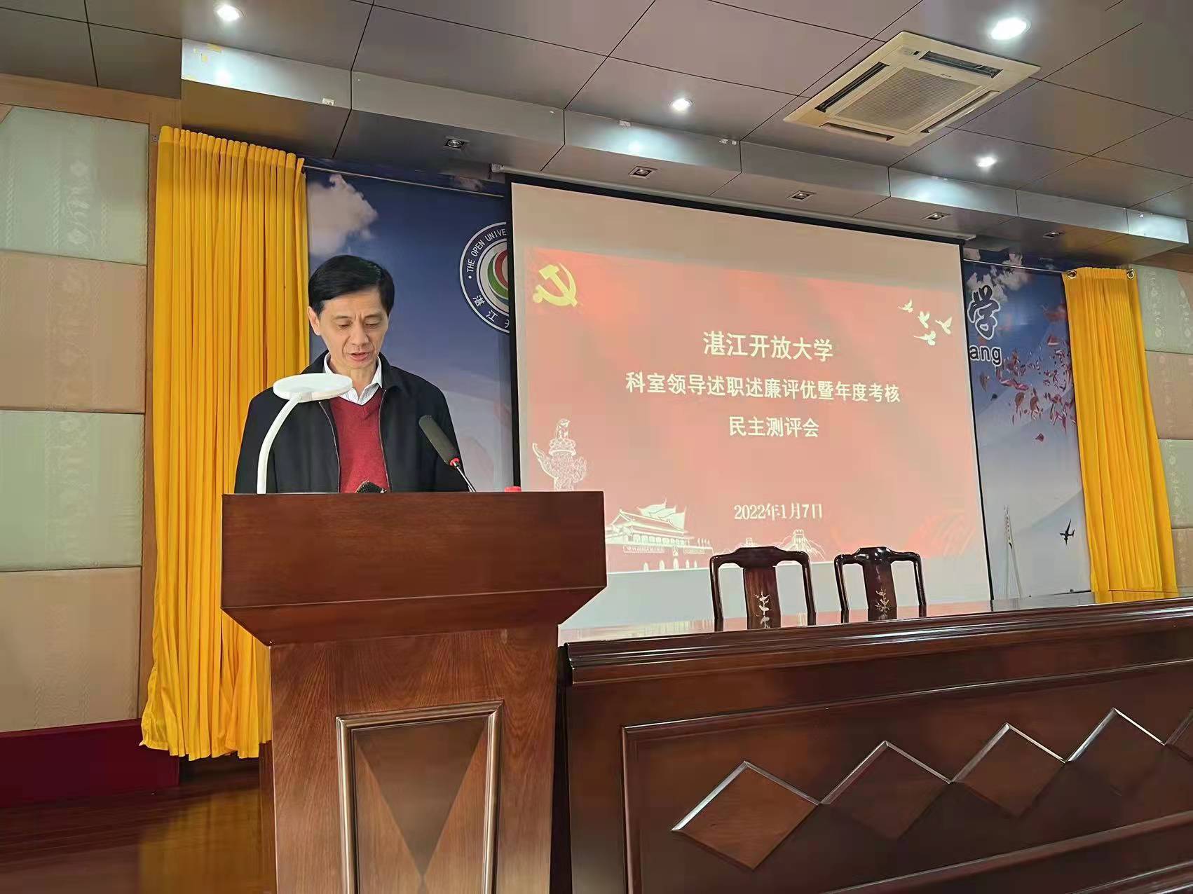 1月7日,湛江开放大学2021年度科室领导述职述廉评优暨年度考核民主测评会在校本部11楼多功能报告厅举行。湛江开放大学全体教职工参加会议。