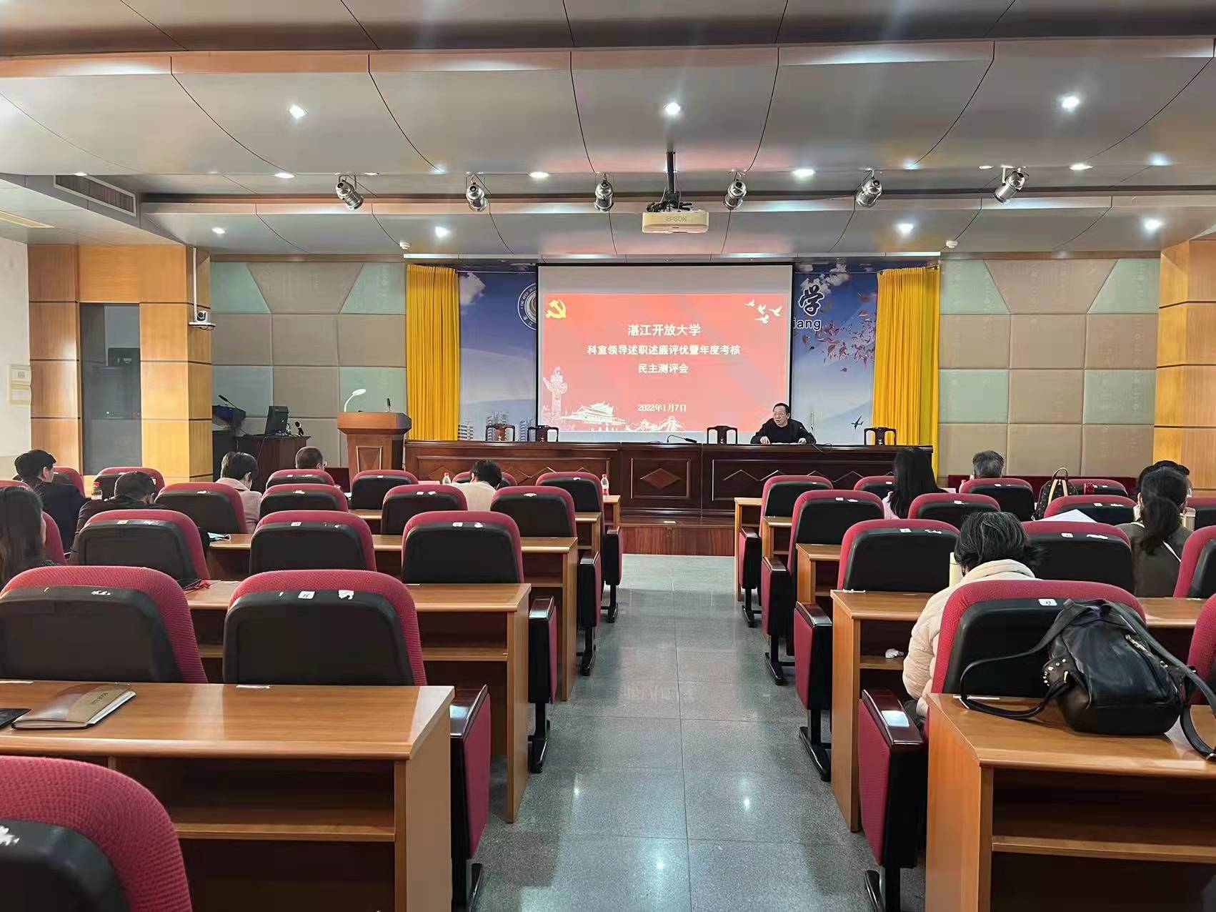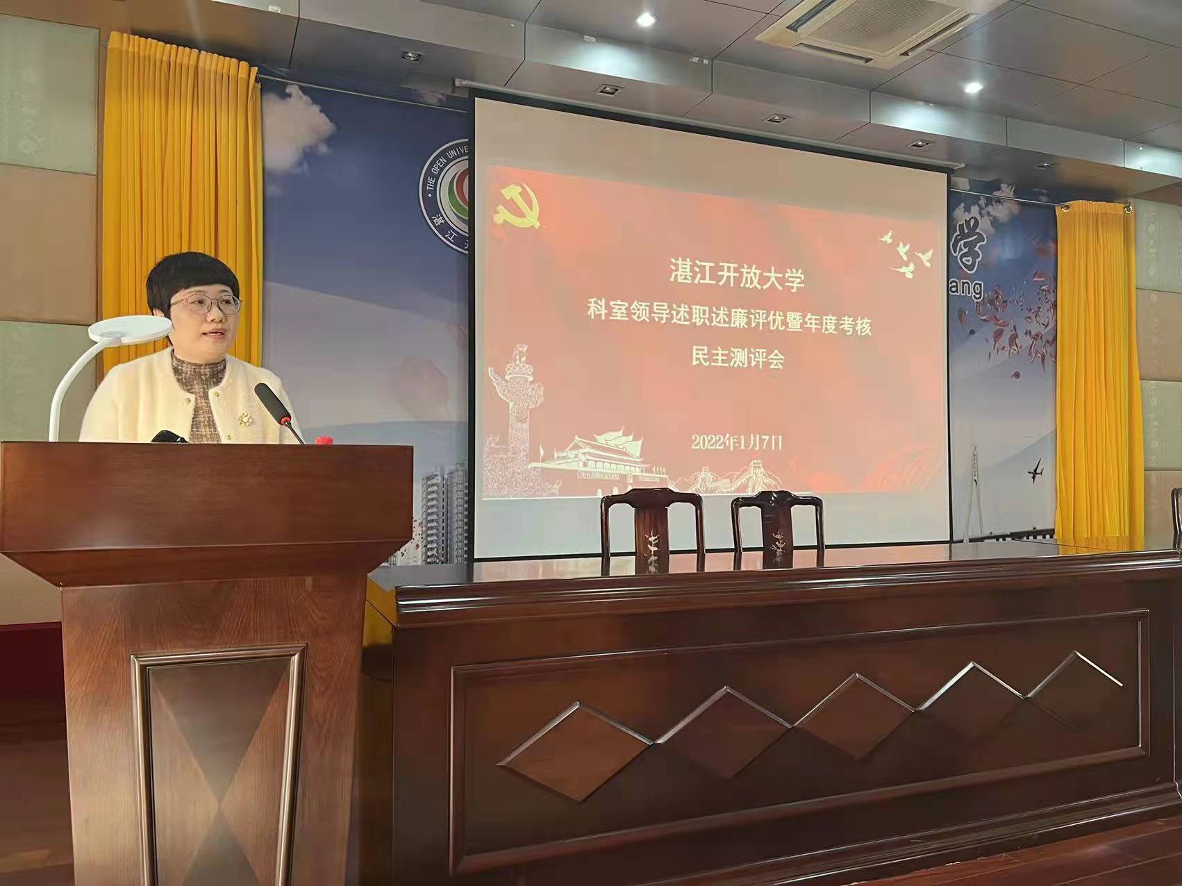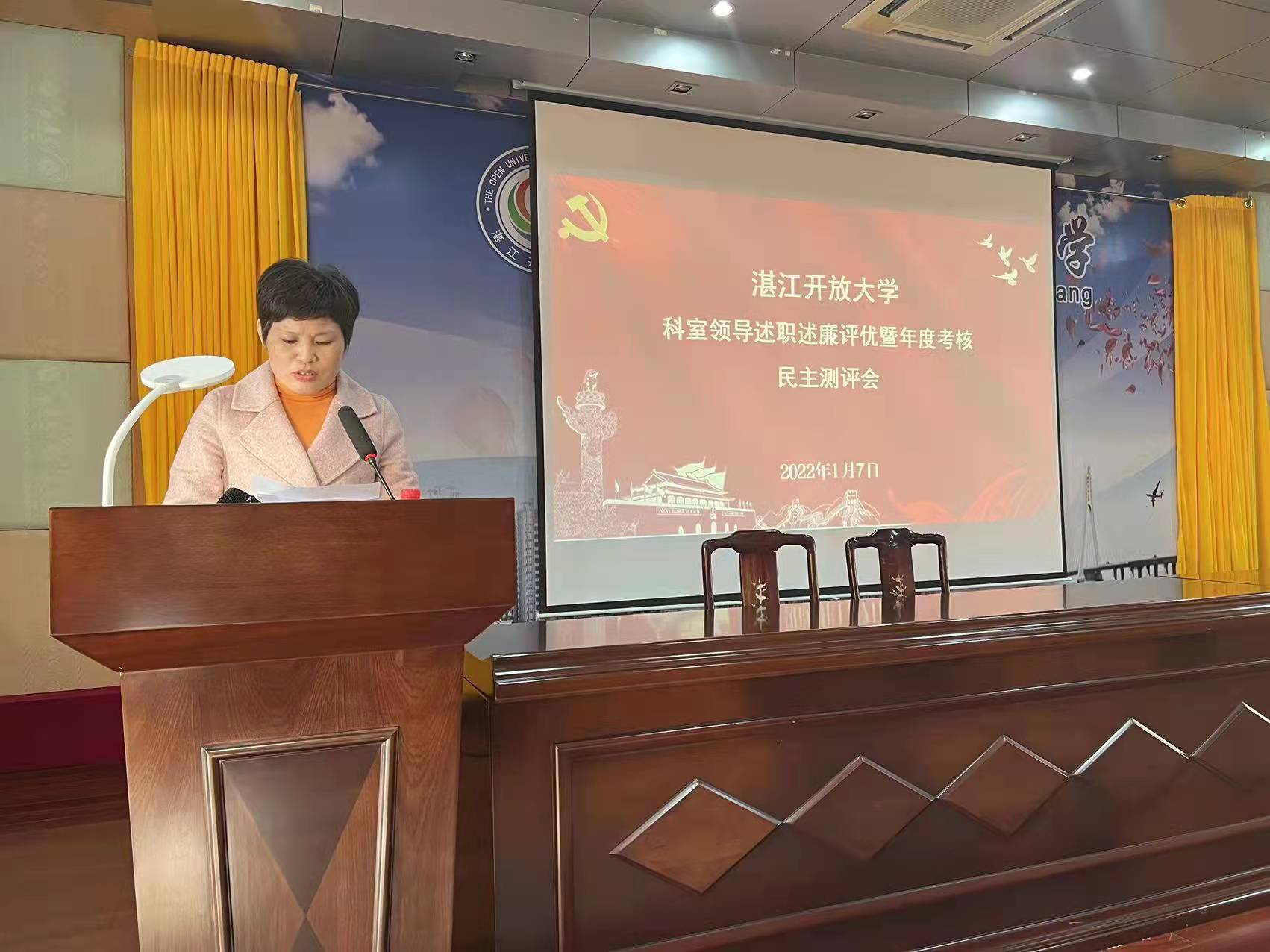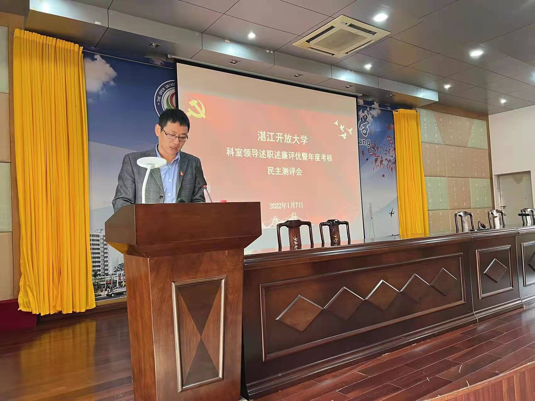 1月7日,湛江开放大学2021年度科室领导述职述廉评优暨年度考核民主测评会在校本部11楼多功能报告厅举行。湛江开放大学全体教职工参加会议。
