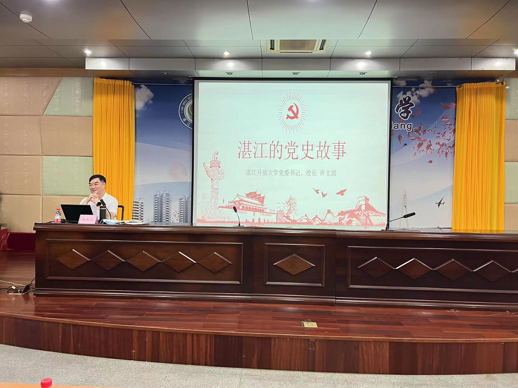 为聚焦理论学习,以史鉴今,在学思践悟中坚定理想信念,在奋发有为中践行初心使命,我校党委书记、校长许文滔同志为新生讲授了开学思政第一课——《湛江的党史故事》。在会上,许文滔同志分别从新民主主义革命时期、社会主义革命和建设时期、改革开放新时期、中国特色社会主义新时代四个时间段讲述了湛江党史100年的发展,指出了党史学习教育既要突出重点又要务求实效。通过本次学习,对全体师生是一次深刻的党性教育和精神洗礼,希望同学们必须牢记党的初心使命,保持艰苦奋斗精神,以史为鉴,以革命先烈为楷模,谨记并切实履行自己的职责,永葆青春活力和政治本色,争做昂扬向前的开大学子。