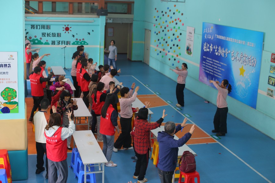 活动在轻快的亲子律动操中拉开序幕。志愿者们协助引导孩子们跟随音乐节奏与家长互动,现场洋溢温馨氛围。