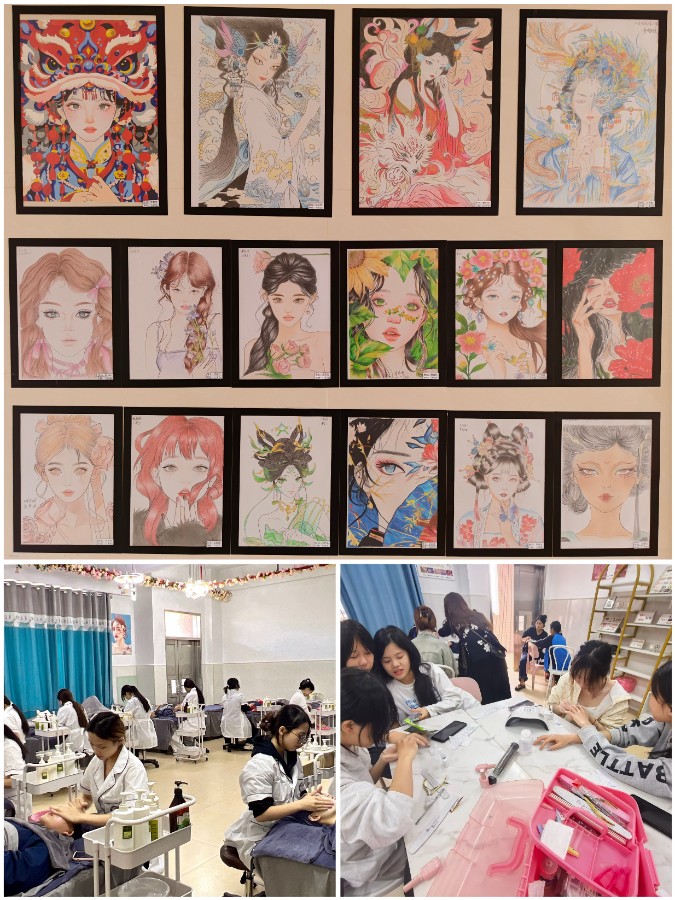 美容美体专业通过现场实操,展示学生美容美甲等方面的专业技能与审美能力。