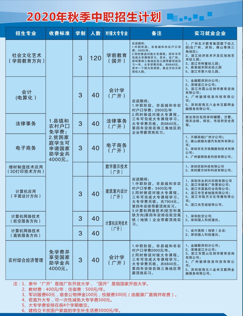 您现在的位置是:首页>财政中专 > 招生就业 > 招生简章 招生简章 2020年秋季招生正在火热进行中,欢迎大家咨询报读 发布人: 日期:2020-04-08 00:00浏览次数:12657点赞次数:5 湛江开大,湛江开放大学,湛江市财政职业技术学校,湛江市广播电视大学,湛江电大,中专教育,中职教育,成人教育,成人大专,成人本科,官网,教育部电子注册,国际学历绿卡。湛江开放大学(湛江市广播电视大学)办学三十年来... 很赞哦!5 上一篇 湛江市财政职业技术学校2022年秋季招生简章 下一篇 2018年秋季招生正在火热进行中,欢迎大家咨询报读 相关文章 2016年秋季招生正在火热进行中,欢迎大家咨询报读 2017年秋季招生正在火热进行中,欢迎大家咨询报读 2018年秋季招生正在火热进行中,欢迎大家咨询报读 2020年秋季招生正在火热进行中,欢迎大家咨询报读 湛江市财政职业技术学校2022年秋季招生简章 湛江市财政职业技术学校2023年秋季招生简章 湛江市财政职业技术学校2024年秋季招生简章
