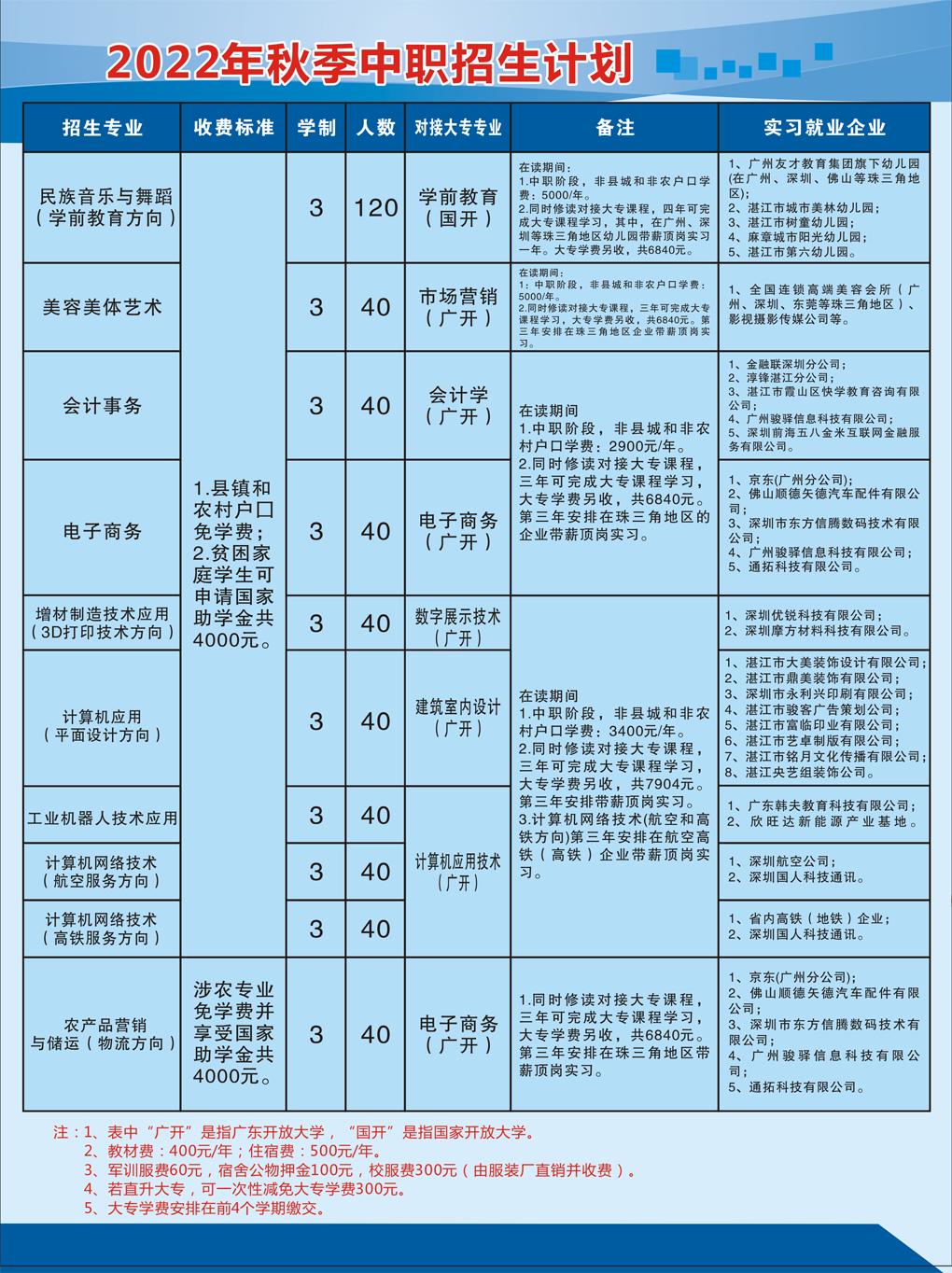 您现在的位置是:首页>财政中专 > 招生就业 > 招生简章 招生简章 湛江市财政职业技术学校2022年秋季招生简章 发布人: 日期:2022-06-07 17:14浏览次数:13659点赞次数:11 湛江开大,湛江开放大学,湛江市财政职业技术学校,湛江市广播电视大学,湛江电大,中专教育,中职教育,成人教育,成人大专,成人本科,官网,教育部电子注册,国际学历绿卡。湛江开放大学(湛江市广播电视大学)办学三十年来... 很赞哦!11 上一篇 湛江市财政职业技术学校2023年秋季招生简章 下一篇 2020年秋季招生正在火热进行中,欢迎大家咨询报读 相关文章 2016年秋季招生正在火热进行中,欢迎大家咨询报读 2017年秋季招生正在火热进行中,欢迎大家咨询报读 2018年秋季招生正在火热进行中,欢迎大家咨询报读 2020年秋季招生正在火热进行中,欢迎大家咨询报读 湛江市财政职业技术学校2022年秋季招生简章 湛江市财政职业技术学校2023年秋季招生简章 湛江市财政职业技术学校2024年秋季招生简章