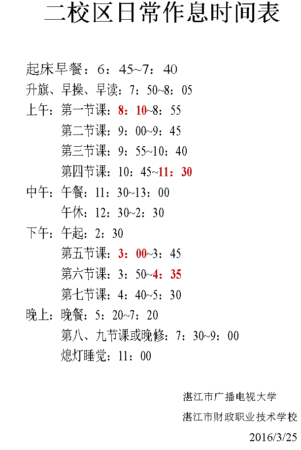 您现在的位置是:首页>财政中专 > 学习园地 > 校规校纪 校规校纪 主校区日常作息时间表 发布人: 日期:2018-04-13 00:00浏览次数:14279点赞次数:6 湛江开大,湛江开放大学,湛江市财政职业技术学校,湛江市广播电视大学,湛江电大,中专教育,中职教育,成人教育,成人大专,成人本科,官网,教育部电子注册,国际学历绿卡。湛江开放大学(湛江市广播电视大学)办学三十年来... 很赞哦!6 上一篇 主校区校门管理规定 下一篇 关于宿舍管理的补充规定 关于宿舍管理的补充规定 为了加强宿舍管理,营造一个整洁舒适的生活环境,在原宿舍管理规定的基础上,现制定若干补充规定,具体内容如下:每天早上8:00、下午3:00前,必须整理好寝室内务,要求叠放好被褥、枕头,挂布要收拢,蚊帐要收起、挂起或靠墙放置。不得在寝室、厅房挂放衣(鞋)物、毛巾和堆放杂物,不得将厅房的储物柜、桌子、凳子搬到别处。未经允许储物柜上不得摆放物品,临时挪用凳子的,用完后要放回原处。除 相关文章 湛江市财政职业技术学校学生管理实施细则 关于宿舍管理的补充规定 主校区日常作息时间表 主校区校门管理规定 课堂教学规程 食堂开放时间