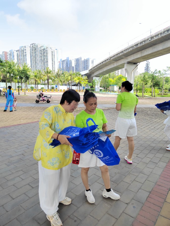 在湛江社区大学王琳老师的带领下,5个老年兴趣班学员先后表演了太极拳、太极扇、八段锦。学员们精神抖擞,动作行云流水,展现了老年群体健康向上的风采,吸引众多市民驻足观看,现场掌声不断。表演结束后,师生们化身宣传志愿者,向市民发放湛江开放大学招生简章,尽管天气炎热,师生们仍热情细致地介绍学校情况,宣传终身学习理念。
