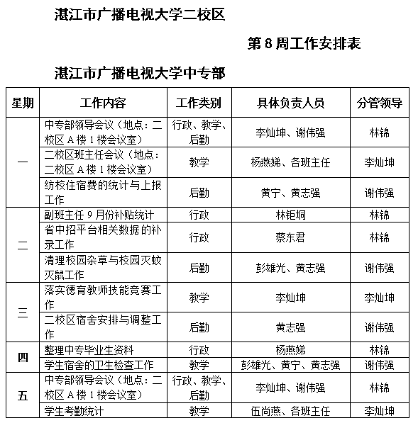 主校区和中专部第8周工作安排