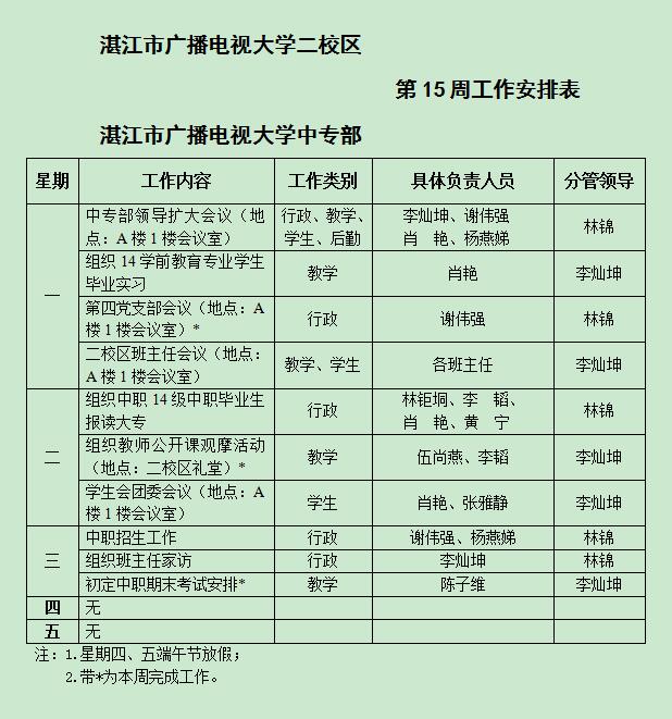主校区和中专部第15周工作安排
