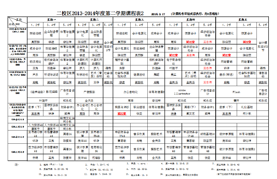 主校区(湛江市财政职业技术学校)2013-2014年度第二学期课程表2 2014.3.17 (计算机考证结束后执行,约3月底始)
