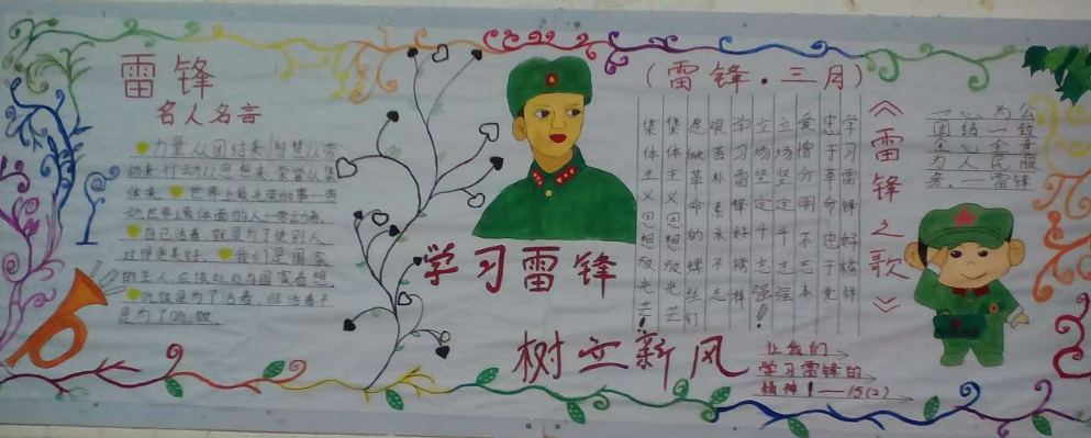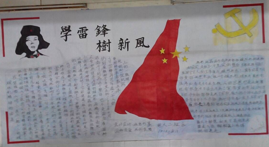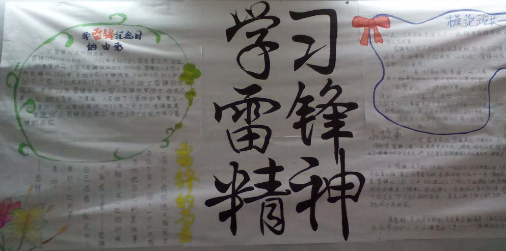 本次"学习雷锋精神"主题墙报设计活动,让同学们更进一步学习和了解雷锋精神,到达对同学们进行思想的教育的目的。这有利于同学们今后投身于学雷锋、讲文明、树新风、建和谐校园之中。