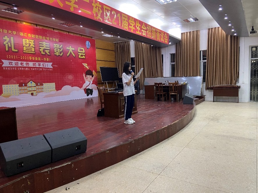 2021年9月22日,晚上7:15分, 湛江开放大学主校区21届学生会纳新活动在主校区礼堂正式开始。面试持续了三个小时多。参会人员有湛江开放大学团委副书记、主校区团总支书记苏舟怡,主校区学生会主席团陈建业,各部门的部长、副部长,以及应聘的新生们。纳新活动主持人由黄海冰同学担任,在她的主持下正式拉开了纳新活动的帷幕。先由苏书记给大家讲话,强调了作为干部的责任心,要立榜样,并鼓励准备参加纳新竞选活动的