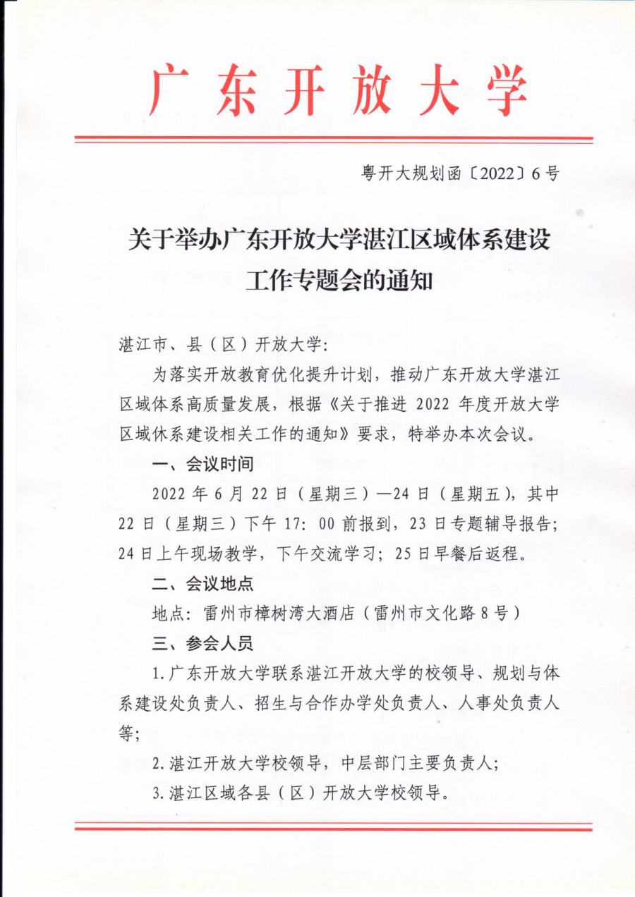 关于举办广东开放大学湛江区域体系建设工作专题会的通知