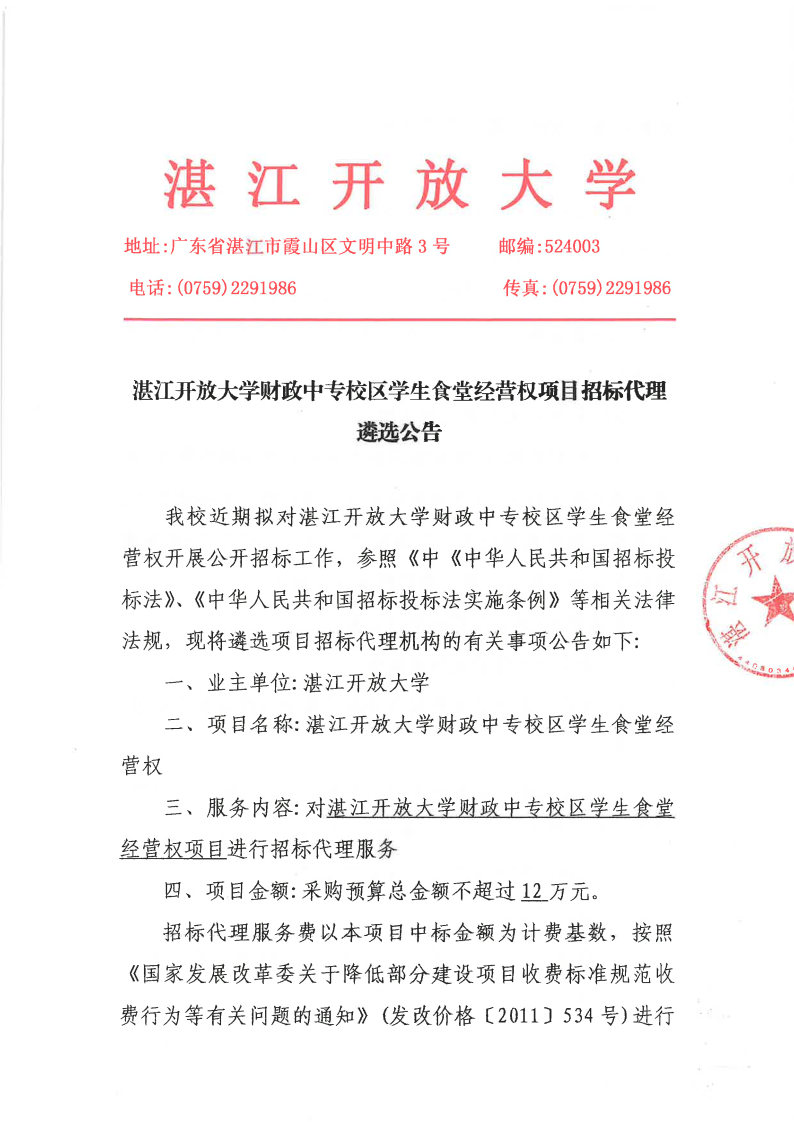 湛江开放大学财政中专校区学生食堂经营权项目招标代理遴选公告